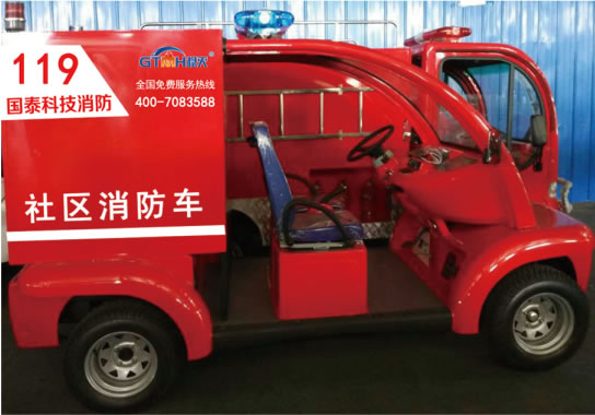The community fire truck is equipped with a high-pressure water mist fire extinguishing device. The water mist fire extinguishing device uses less water and has a high fire extinguishing level. The spray distance of the water mist is more than 12 meters. The vehicle is also equipped with a water storage tank, a water gun, and a water hose (which can be added according to user needs). It can carry 200 kilograms of water, and the water gun can achieve any conversion between direct flow, water mist, and foam, achieving efficient fire extinguishment. The community fire truck is started by an electric motor and can carry 2 people for emergency rescue.