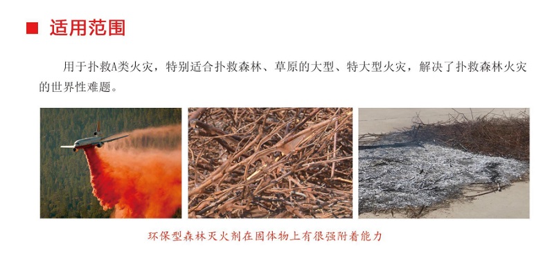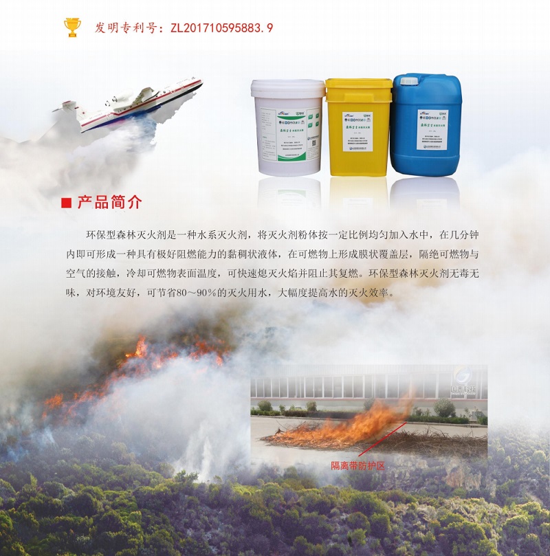 Environmentally friendly forest fire extinguishing agent is a water-based fire extinguishing agent. When the fire extinguishing agent powder is evenly added to water at a certain ratio, a viscous liquid with excellent flame retardant ability can be formed within a few minutes. This liquid forms a film-like covering layer on combustible materials, isolating them from contact with air, cooling the surface temperature of the combustible materials, and quickly extinguishing the flames and preventing them from reigniting. The environmentally friendly forest fire extinguishing agent is non-toxic and odorless, friendly to the environment, and can save 80~90% of the water used for fire extinguishment, greatly improving the efficiency of water in fire extinguishment.
